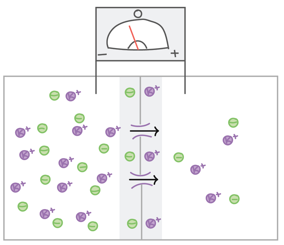 One take-away from the Nernst equation is relevant to us: the charge that needs to be delivered to prevent the movement of ions is dependent on the difference in concentration of the ions across the membrane. If there is a large concentration difference, then a larger charge has to be delivered to oppose ionic movement than when the concentration gradient is small.