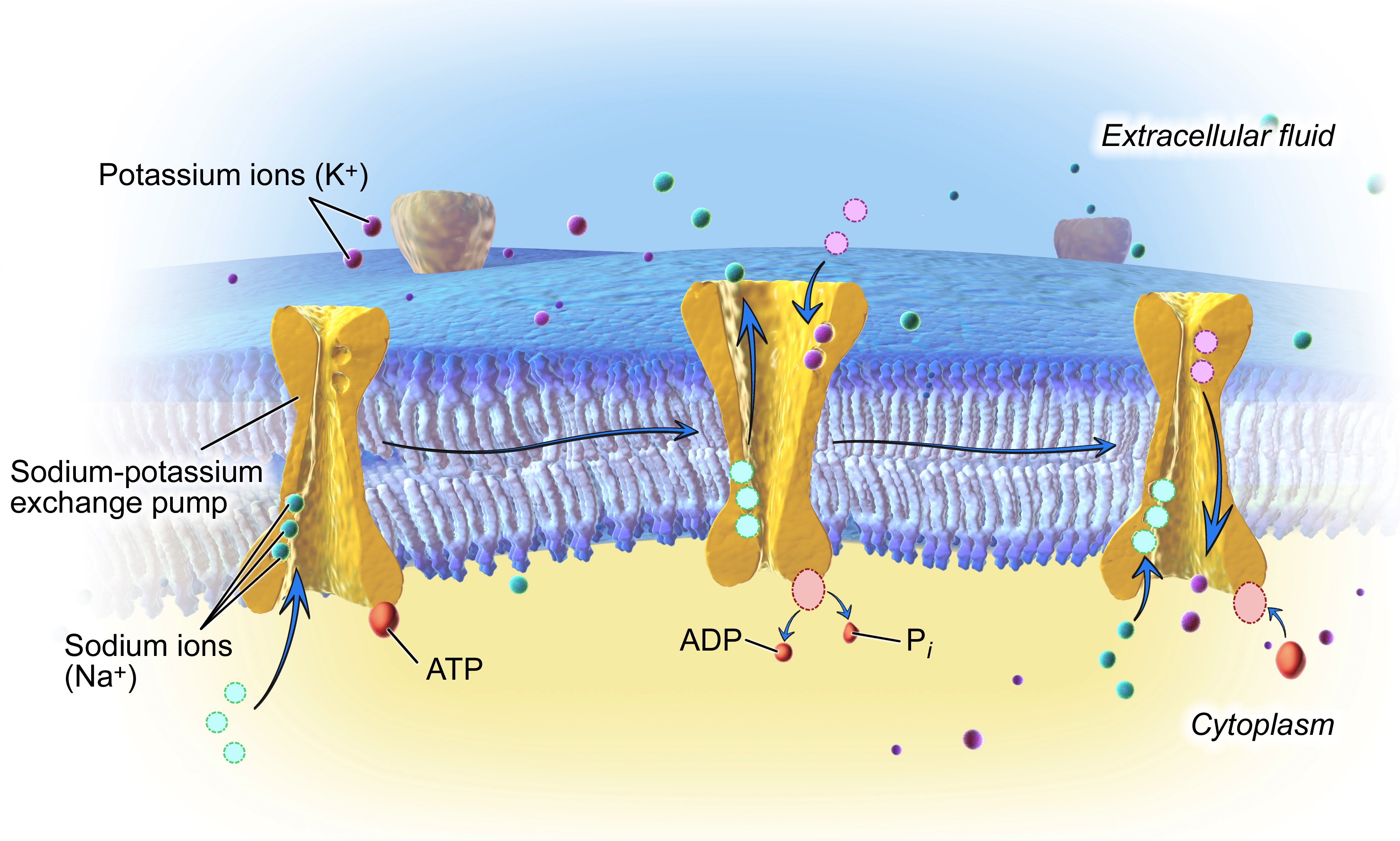 The lipid bilayer that forms the wall of a neuron (or glial cell) is not permeable to charged ions. However, there are a number of types of ion channels that allow ions to move down their concentration gradient across the membrane, and ion transporters that allow ions to move against their concentration gradient (from low concentration to high concentration). One of the best examples of an ion transporter is the sodium-potassium pump (also called Na+/K+ pump or Na+/K+ ATPase), which pumps potassium into a cell and sodium out of a cell, both against their concentration gradients, with the use of ATP to provide energy for the process. The actions of this pump sequester K+ inside of neurons and extrude Na+ from neurons (in other words, the sodium potassium pump causes intracellular K+ to be high and intracellular Na+ to be low, relative to the extracellular fluid).