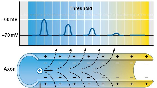 As an EPSP or IPSP propagates passively down a dendrite, it is altered by the physical properties of the neuronal membrane. This distorts the shape of an EPSP or an IPSP, so that if the electrical potential was recorded at a distance from the synapse where the potential was generated, it would look quite different that near the synapse. By use of cable theory, the change in the properties of an EPSP or IPSP as it moves down a membrane can be modeled mathematically. However, this is certainly beyond the scope of this course.