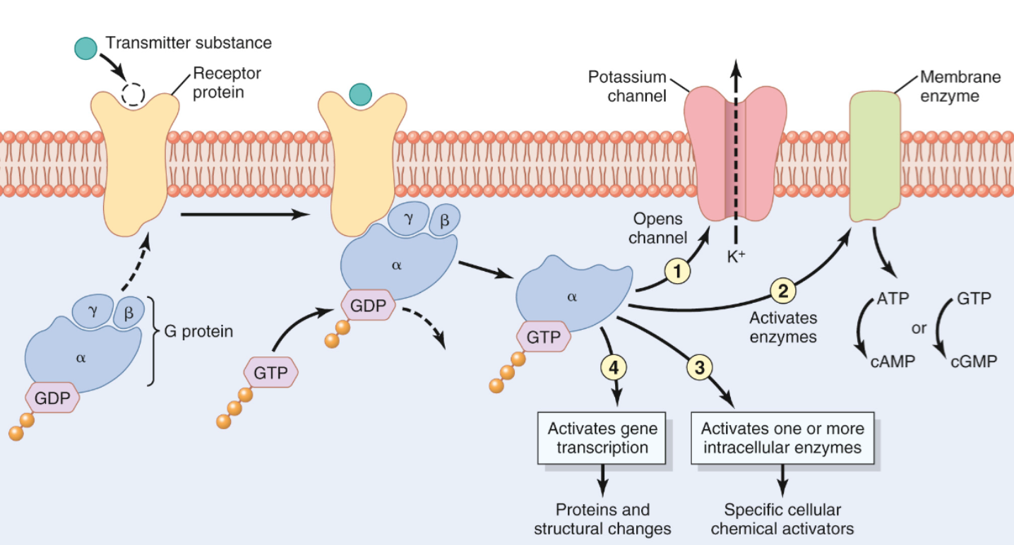 There are several types of second messenger systems. One of the most common types entails the activation of G proteins. In the example below, the inactive G protein complex in the cytosol consists of guanosine diphosphate (GDP) plus three components: an alpha (α) component that is the activator portion of the G protein, and beta (β) and gamma (γ) components that are attached to the alpha component. As long as the G protein complex is bound to GDP, it remains inactive. When the receptor is activated by a neurotransmitter, the receptor undergoes a conformational change, exposing a binding site for the G protein complex, which then binds to the receptor. This causes the α subunit to release GDP and simultaneously bind guanosine triphosphate (GTP) while separating from the β and γ portions of the complex. The separated α-GTP complex is then free to move within the cytoplasm and have a number of potential effects.